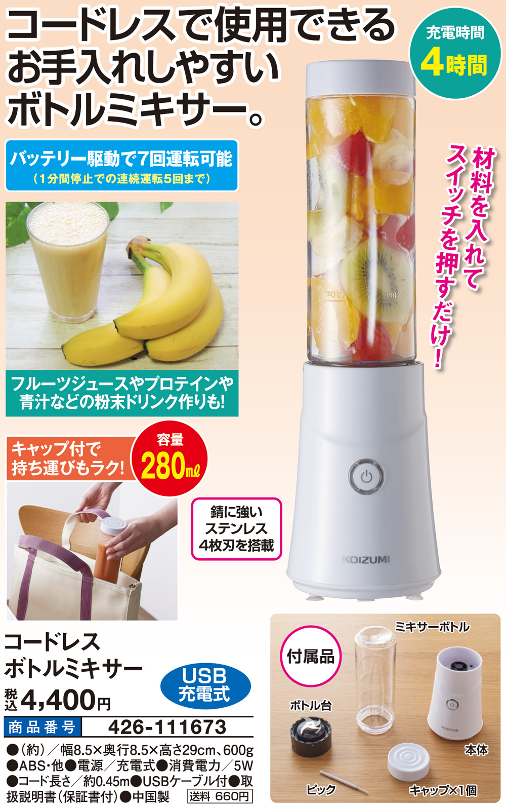 材料を入れてスイッチを押すだけ! バッテリー駆動で7回運転可能 (1分間停止での連続運転5回まで) フルーツジュースやプロテインや青汁などの粉末ドリンク作りも! キャップ付で持ち運びもラク! 錆に強いステンレス4枚刃を搭載 ◎USB充電式 ◎充電時間:4時間 ◎容量280ml 【付属品】 ・本体 ・ミキサーボトル ・ピック ・ボトル台 ・キャップ×1個