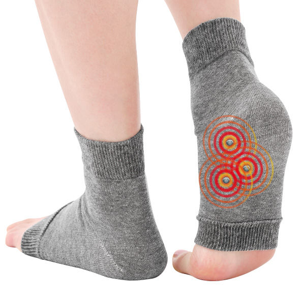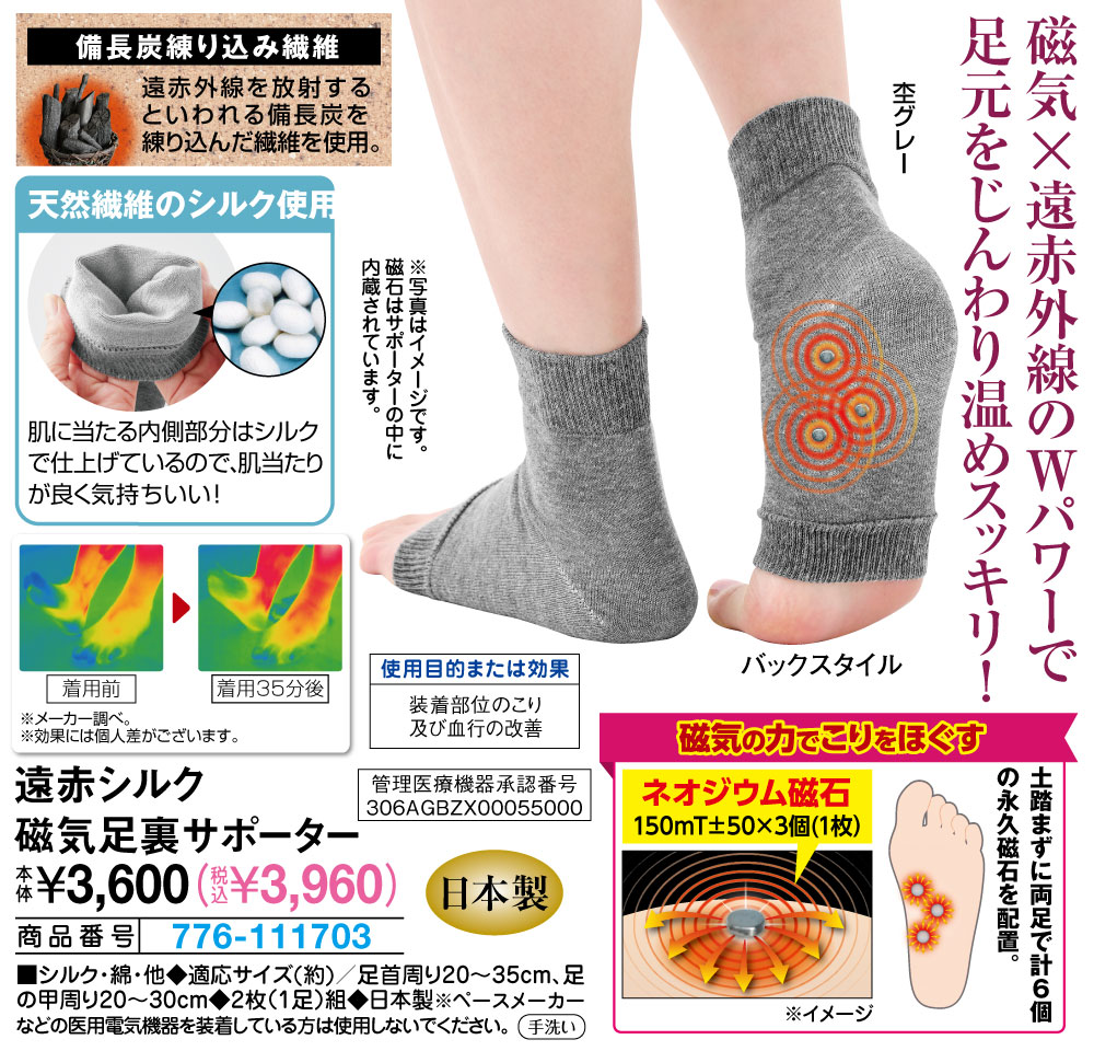 磁気×遠赤外線のWパワーで足元をじんわり温めスッキリ! 【備長炭練り込み繊維】 遠赤外線を放射するといわれる備長炭を練り込んだ繊維を使用。 【天然繊維のシルク使用】 肌に当たる内側部分はシルクで仕上げているので、肌当たりが良く気持ちいい! 【磁気の力でこりをほぐす】 ネオジウム磁石 150mT±50×3個(1枚) 土踏まずに両足で計6個の永久磁石を配置。 【使用目的または効果】 装着部位のこり及び血行の改善 ◆管理医療機器承認番号:306AGBZX00055000