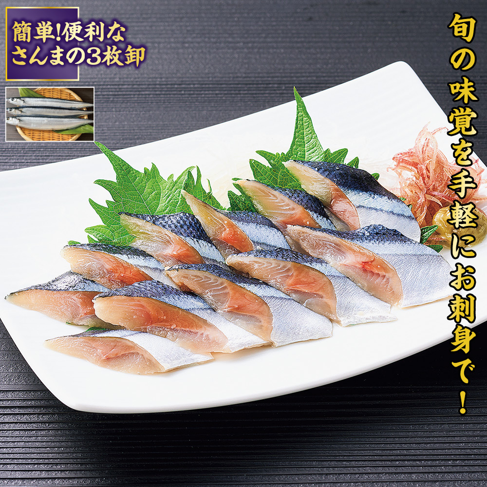 簡単!便利なさんまの3枚卸。 北海道青森沖で漁獲したさんまをお刺身用に3枚卸にしました。 解凍して切るだけです。
