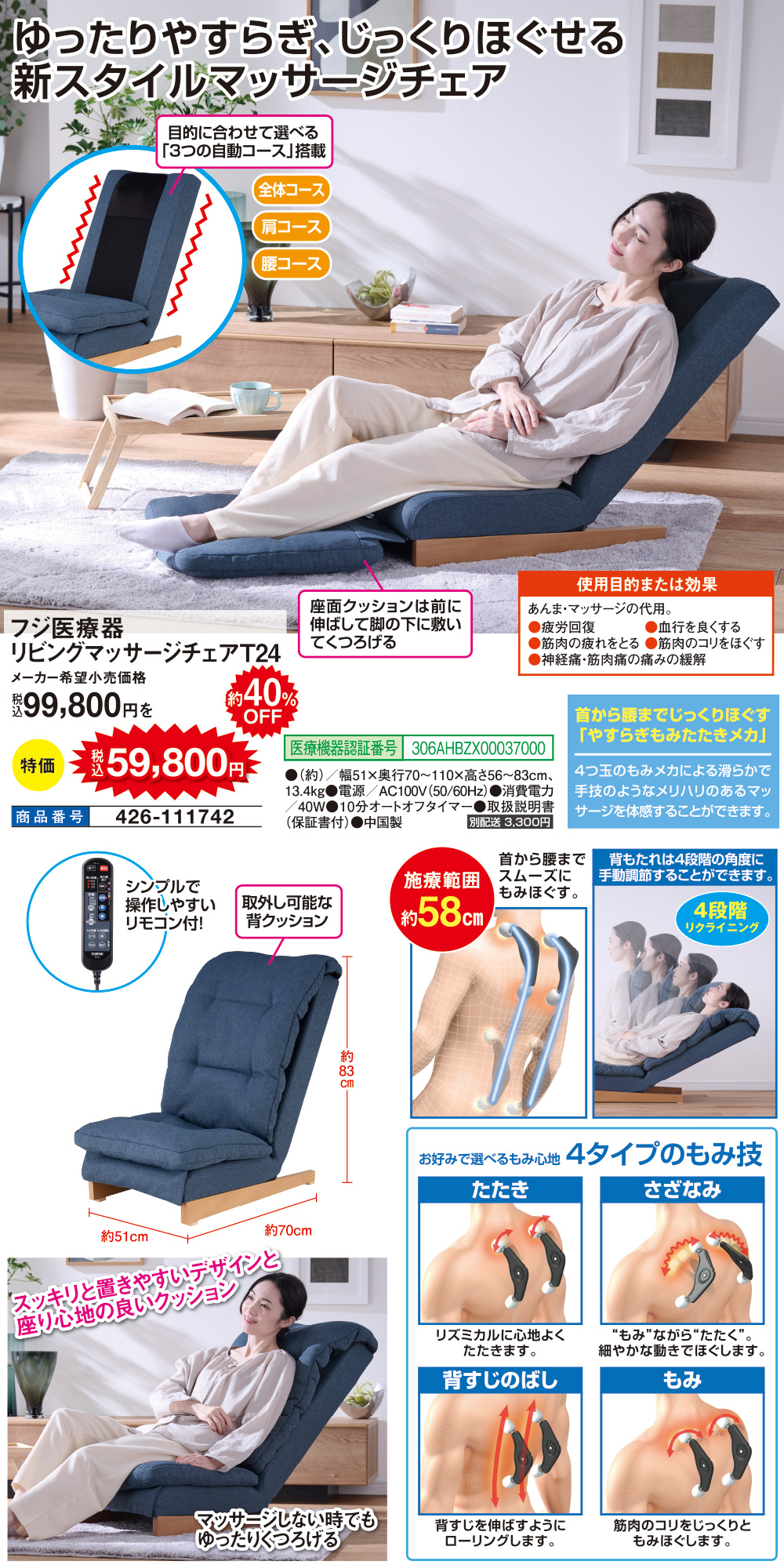 スッキリと置きやすいデザインと座り心地の良いクッション 目的に合わせて選べる「3つの自動コース」搭載 ・全体コース ・肩コース ・腰コース ◎シンプルで操作しやすいリモコン付! ◎施療範囲:約58cm ◎4段階リクライニング 【お好みで選べるもみ心地 4タイプのもみ技】 ・たたき ・さざなみ ・背すじのばし ・もみ 【使用目的または効果】 あんま・マッサージの代用。 ●疲労回復 ●血行を良くする ●筋肉の疲れをとる ●筋肉のコリをほぐす ●神経痛・筋肉痛の痛みの緩解 医療機器認証番号:306AHBZX00037000
