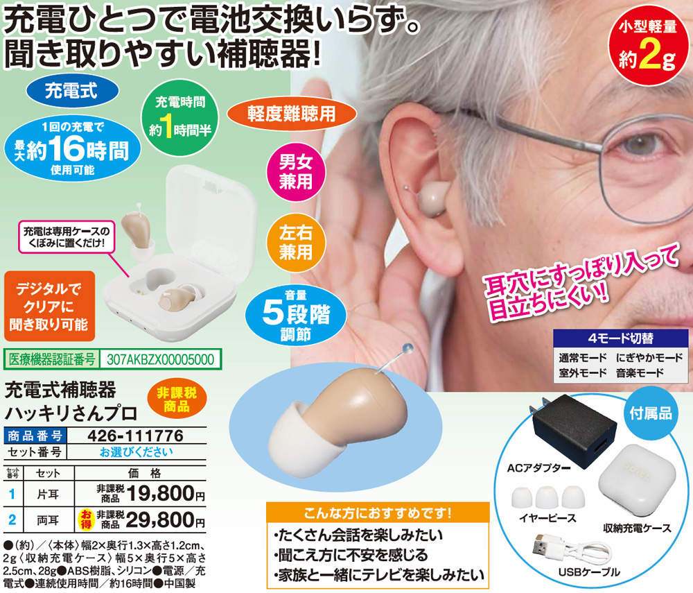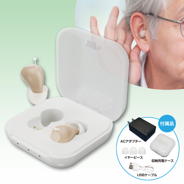耳穴にすっぽり入って目立ちにくい! デジタルでクリアに聞き取り可能。 充電は専用ケースのくぼみに置くだけ! 【4モード切】 ・通常モード ・にぎやかモード ・室外モード ・音楽モード 【こんな方にオススメ】 ●たくさん会話を楽しみたい ●聞こえ方に不安を感じる ●家族と一緒にテレビを楽しみたい 【付属品】 ・ACアダプター ・イヤーピース ・収納充電ケース ・USBケーブル ◎軽度難聴用 ◎男女兼用 ◎小型軽量約2kg ◎充電時間約1時間半 ◎1回の充電で最大約16時間使用可能 ◎音量5段階調節