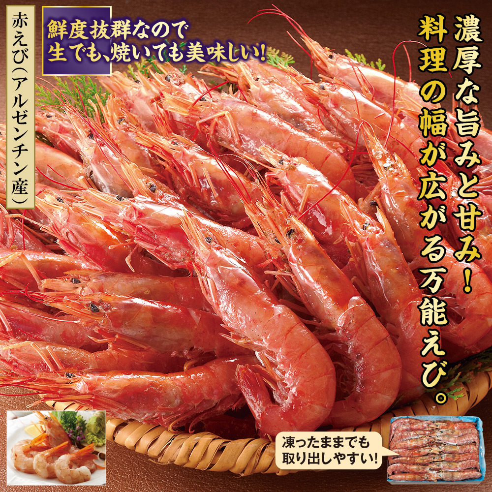 【赤えび(アルゼンチン産)】 鮮度抜群なので生でも、焼いても美味しい! 水揚げ後、急速冷凍しているので鮮度抜群! 口に入れた瞬間に感じる濃厚な旨みと甘み、プリプリとした食感は赤えびならではです。 凍ったままでも取り出しやすい!