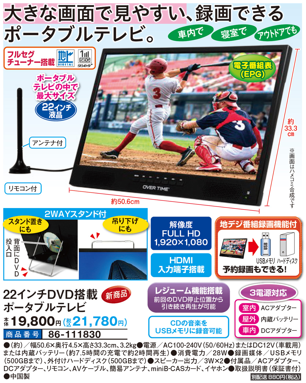大きな画面で見やすい、録画できるポータブルテレビ! 車内でも寝室でもアウトドアでも! ポータブルテレビの中で最大サイズの22インチ液晶です。 ●解像度FULL HD 1920×1080 ●フルセグチューナー搭載 ●HDMI入力端子搭載 ●DVD搭載 ●レジューム機能搭載 前回のDVD停止位置から引き続き再生が可能 ●地デジ番組録画機能付 USBメモリやハードディスクに予約録画もできる! ●電子番組表(EPG) ●CDの音楽をUSBメモリに録音可能 ●2WAYスタンド付(スタンド置き・吊り下げ) ●3電源対応(室内ACアダプター・屋外内蔵バッテリー・車内DCアダプター) ●アンテナ付 ●リモコン付