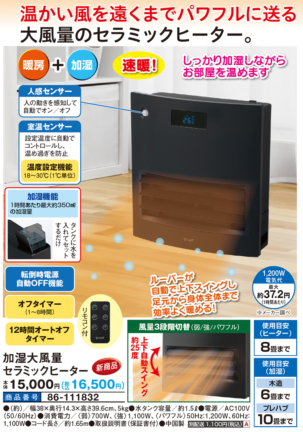 温かい風を遠くまでパワフルに送る大風量のセラミックヒーター! 冷え込む季節も快適に! 暖房家電 しっかり加湿しながらお部屋を温めます。 ルーバーが自動で上下スイングし足元から身体全体まで効率よく暖める! ●暖房+加湿 ●速暖! 【人感センサー】 人の動きを感知して自動でオン/オフ。 【室温センサー】 設定温度に自動でコントロールし、温め過ぎを防止。 ●温度設定機能:18~30度(1度単位) 【加湿機能】 1時間あたり最大約350mLの加湿量。 タンクに水を入れてセットするだけ。 ●転倒時電源自動OFF機能 ●オフタイマー(1~8時間) ●12時間オートオフタイマー ●風量3段階切替(弱/強/パワフル):上下自動スイング 約25度 ●リモコン付 ●使用目安(ヒーター):8畳まで ●使用目安(加湿):木造 6畳まで、プレハブ 10畳まで