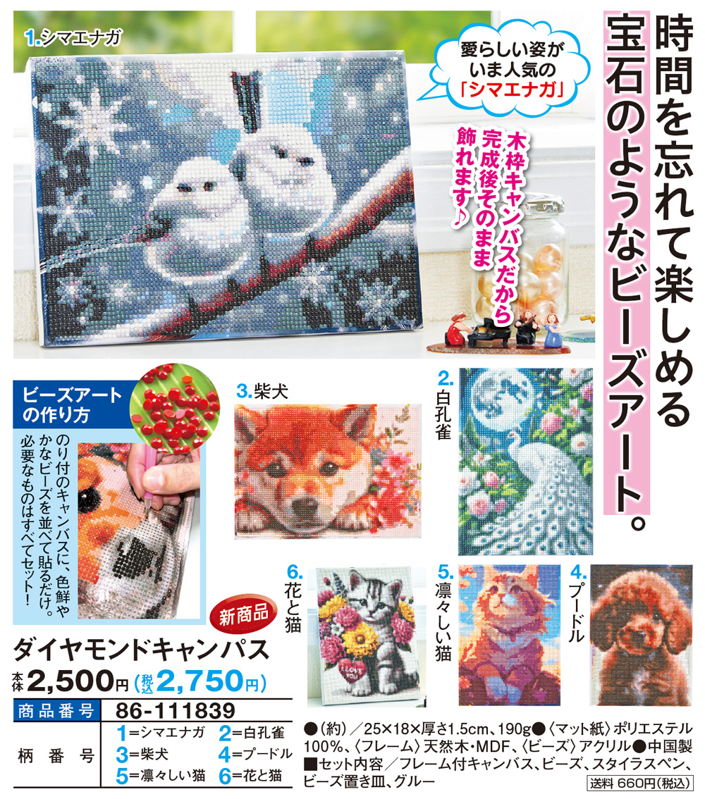 時間を忘れて楽しめる宝石のようなビーズアート! 【ビーズアートの作り方】 のり付のキャンバスに、色鮮やかなビーズを並べて貼るだけ。必要なものはすべてセット! 木枠キャンバスだから完成後そのまま飾れます♪ 【選べるデザイン】 1.シマエナガ(愛らしい姿がいま人気) 2.白孔雀 3.柴犬 4.プードル 5.凛々しい猫 6.花と猫