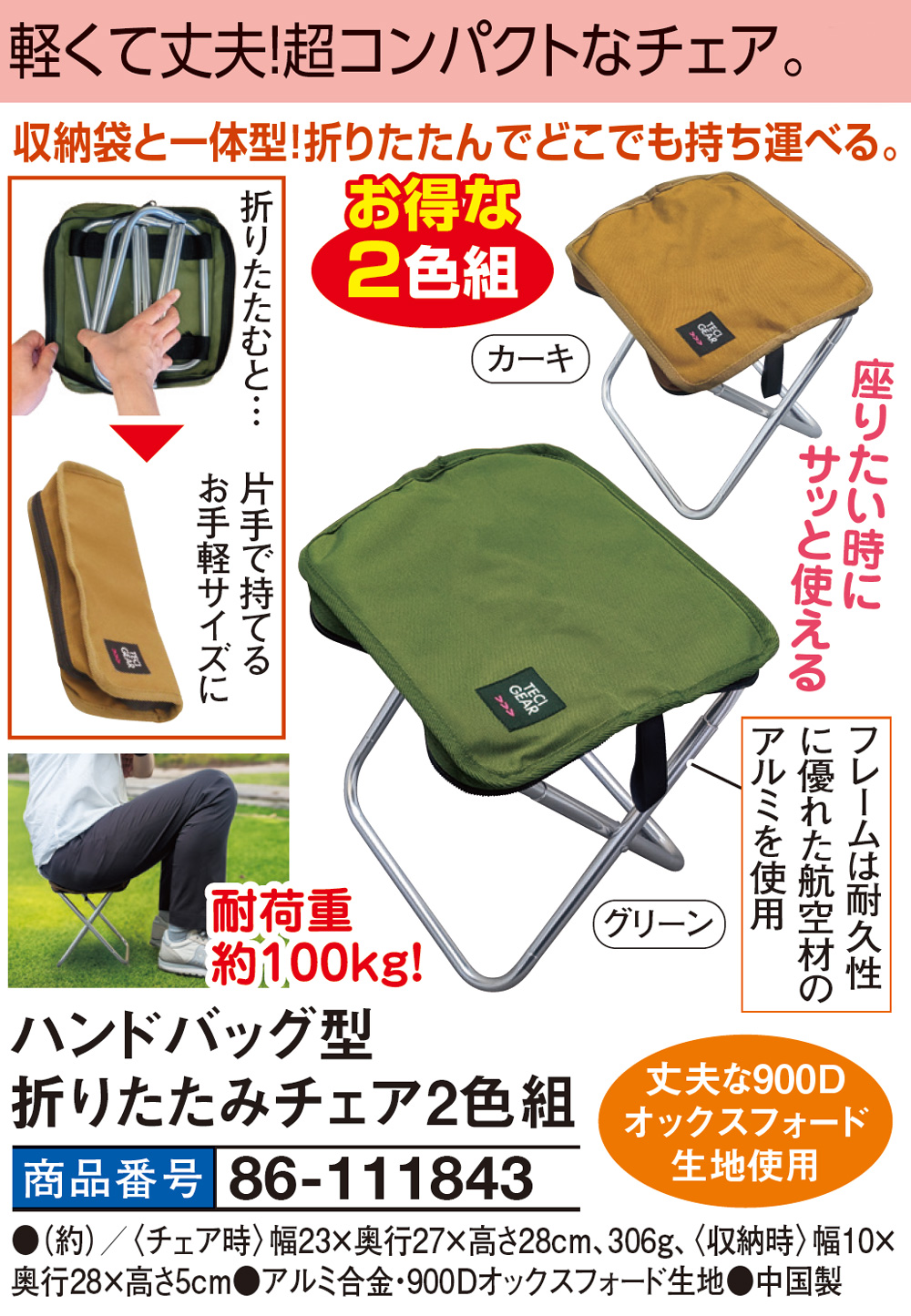 軽くて丈夫!超コンパクトなチェア! 収納袋と一体型!折りたたんでどこでも持ち運べる。 座りたい時にサッと使える フレームは耐久性に優れた航空材のアルミを使用 丈夫な900Dオックスフォード生地使用 折りたたむと片手で持てるお手軽サイズに 耐荷重 約100kg! ●お得な2色組