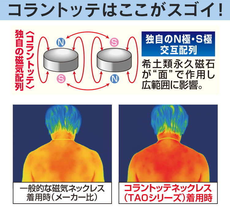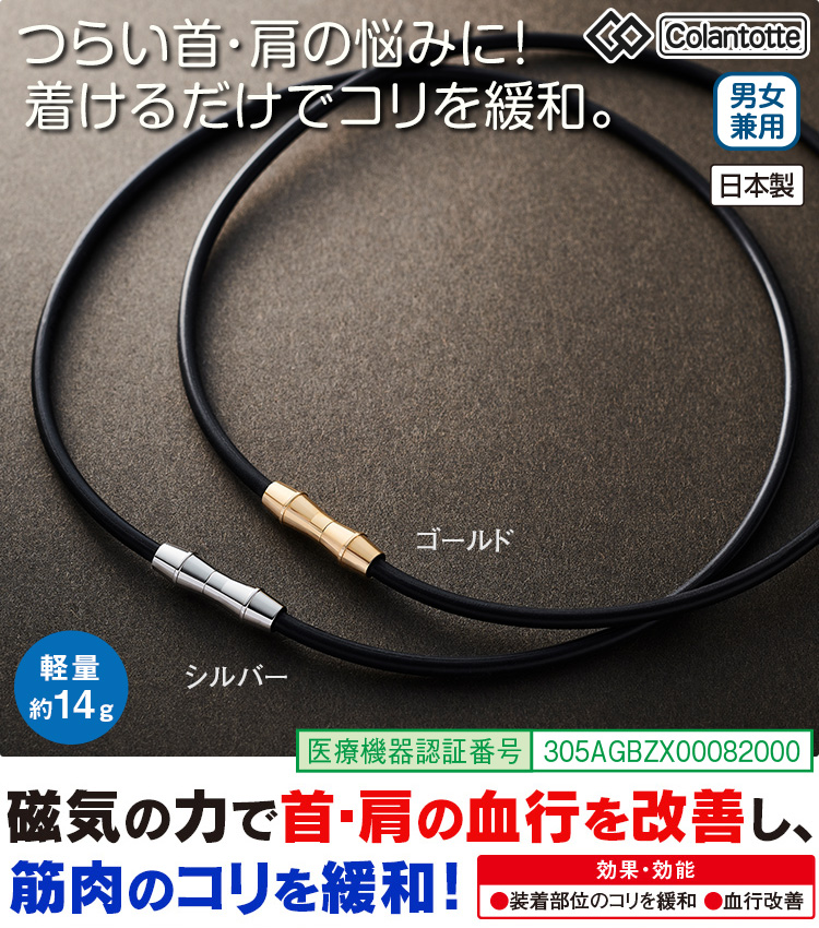 独自の磁気配列で血行を改善し筋肉のコリを緩和 <マグネット式トップジョイント> トップジョイントの素材は丈夫で錆びにくい高品位ステンレスを使用 ・ジャケットなど様々なコーディネートのアクセントになるデザイン ・細めのループで軽い着け心地 【効果・効能】装着部位のコリを緩和・血行改善 【医療機器認証番号】305AGBZX00082000 ●水に強いシリコン素材 ●男女兼用 ●日本製