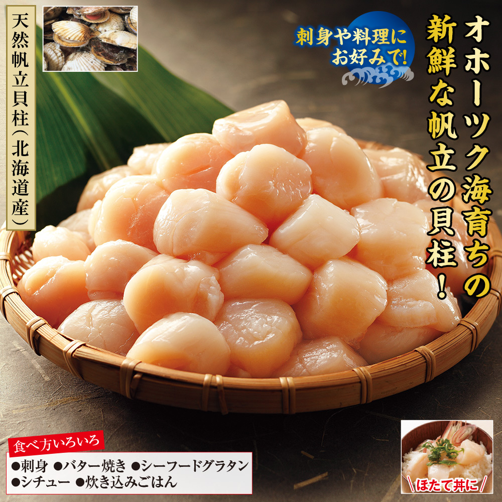 【天然帆立貝柱(北海道産)】 新鮮な生の帆立貝柱を急速冷凍。 強い甘みとコクは北海道産ならではです。 ボリューム満点でこのお値段は見逃せません。 刺身や料理にお好みで! 食べ方いろいろ ・刺身・バター焼き・シーフードグラタン・シチュー ・炊き込みごはん