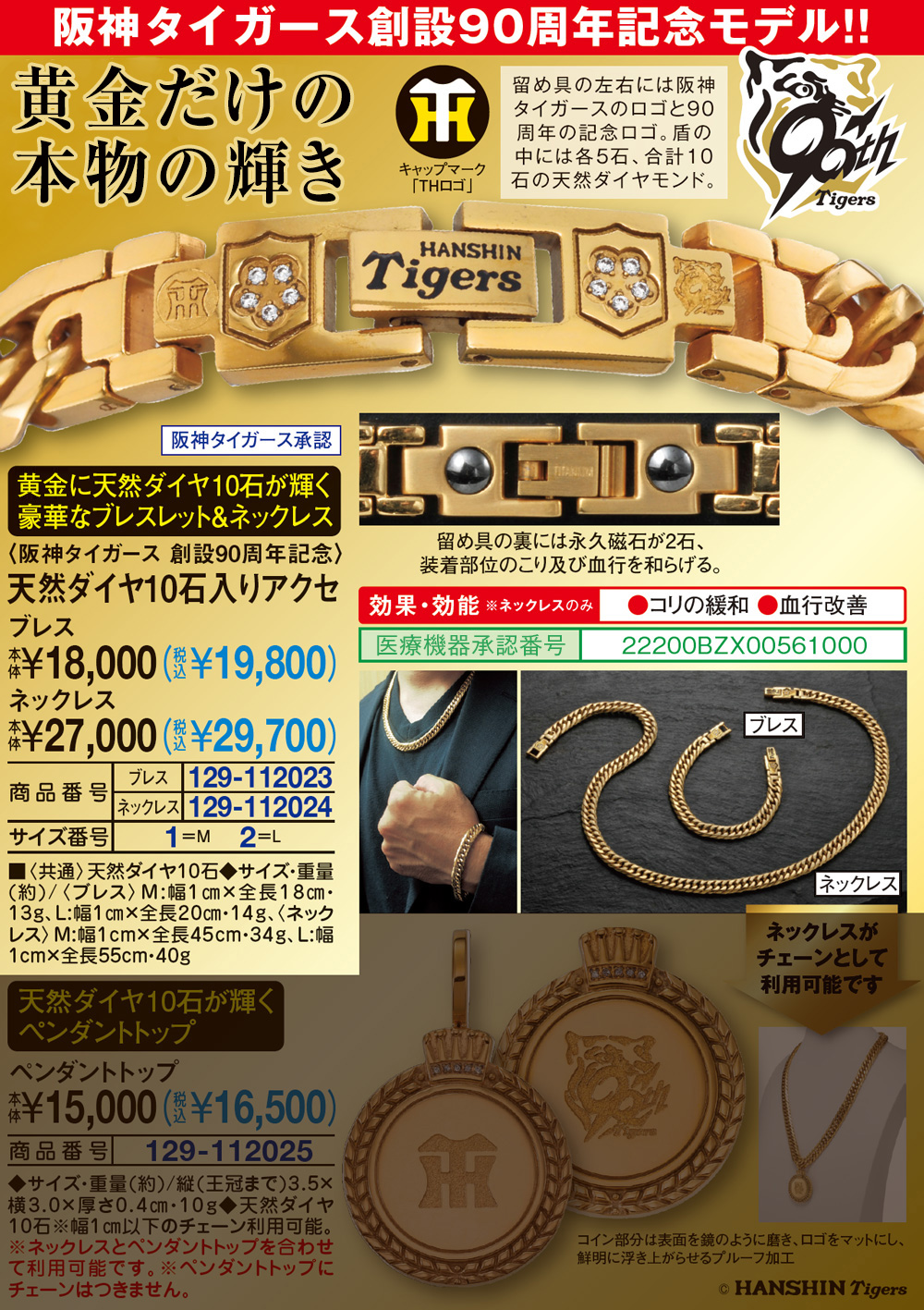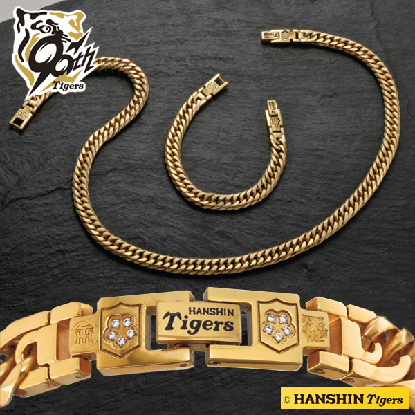 黄金に天然ダイヤ10石が輝く豪華なブレスレット&ネックレス 黄金だけの本物の輝き 留め具の左右には阪神タイガースのロゴと90周年の記念ロゴ。 横の盾の中には各5石、永遠の輝きを持つ計10石の天然ダイヤモンド。 【効果・効能 ※ネックレスのみ】 ●コリの緩和 ●血行改善 医療機器承認番号:22200BZX00561000 留め具の裏には永久磁石が2石、装着部位のこり及び血行を和らげる。 阪神タイガース承認