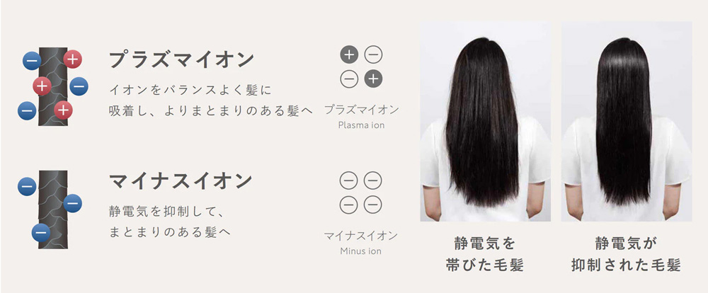 プラスとマイナス両方のイオンを放出。イオンのバランスを整え美髪へ。