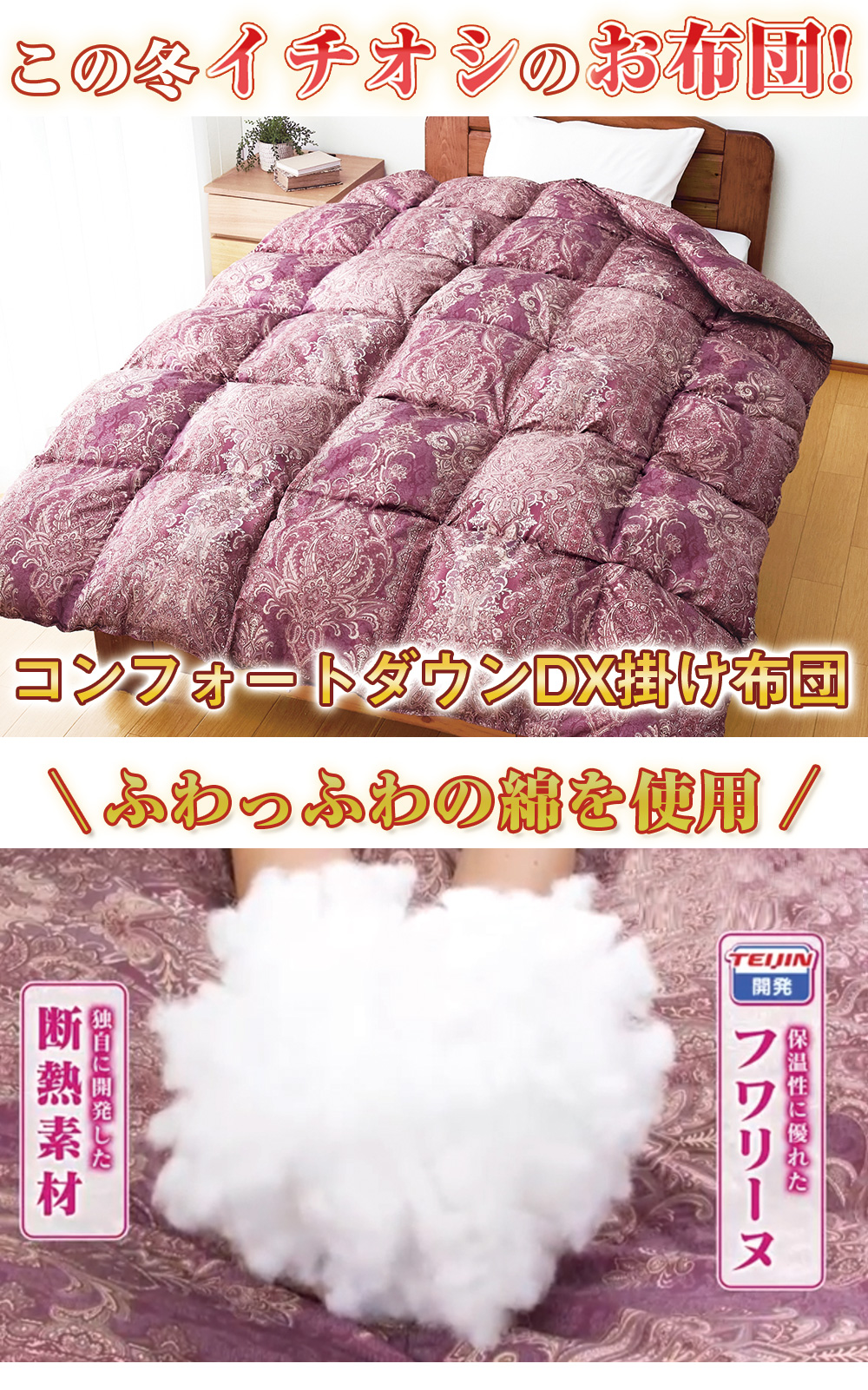 高い技術を誇るテイジンの高機能素材「フワリーヌ」と断熱性に優れた特殊粒わたを中わたに使った、超あったか掛け布団です。