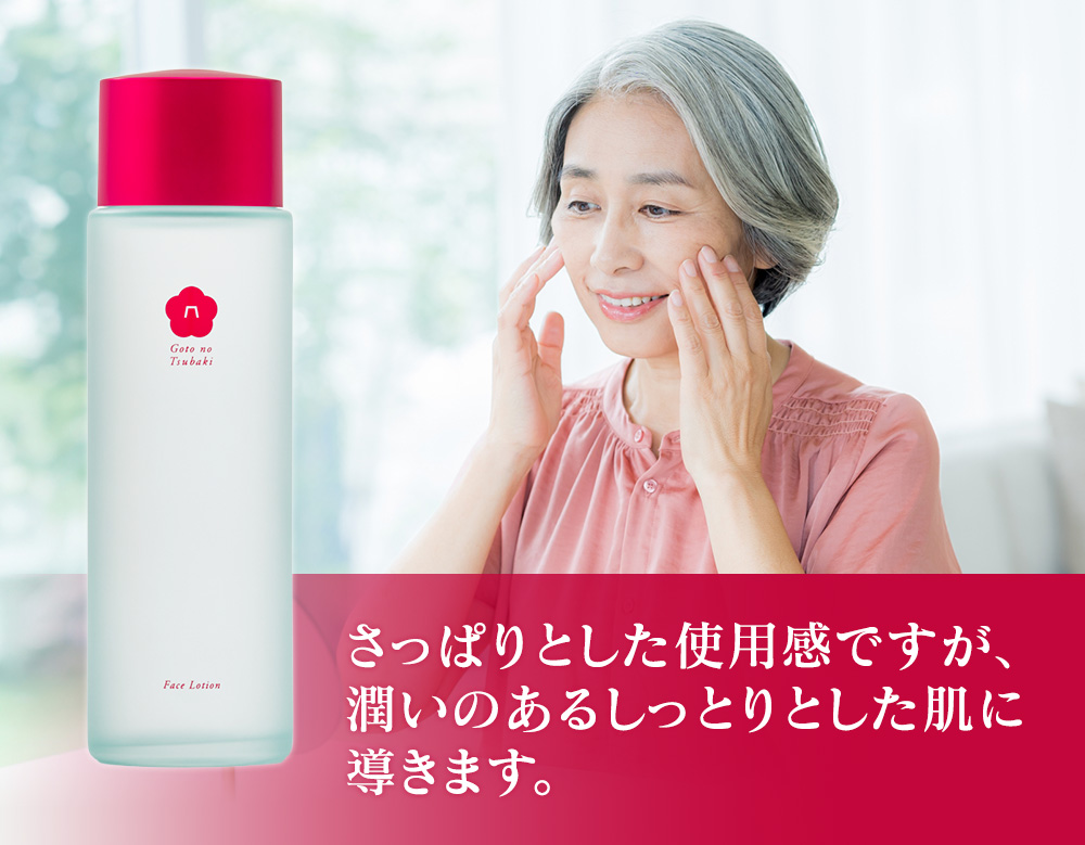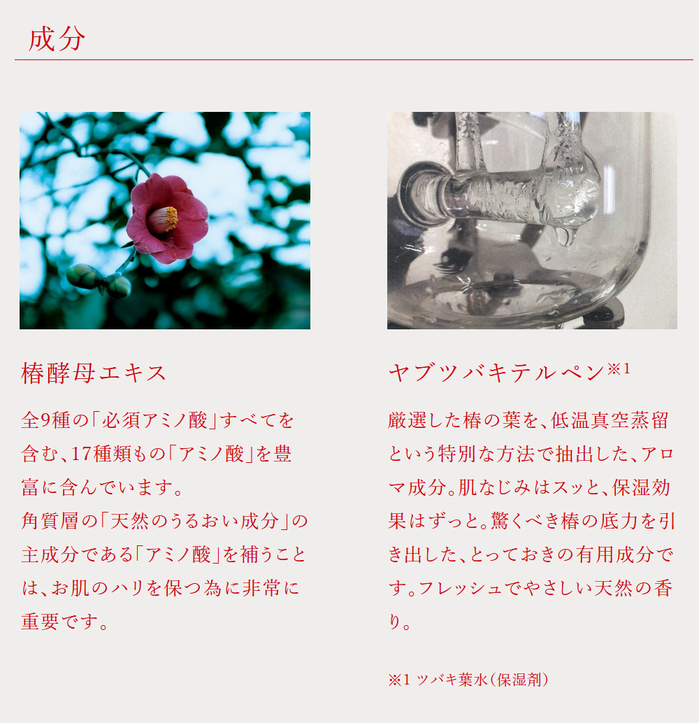 しっとりをたっぷり。年々潤いが失われるお肌に。 椿の葉から抽出される、うるおい成分「ヤブツバキテルペン(※1)」が肌への浸透力を高め、年々厚く、硬くなる肌の角質層まで、しっかりとうるおいを届けます。 また、アミノ酸を豊富に含んだ「椿酵母エキス(※2)」が肌にハリとツヤを与えてくれます。さっぱりとした使用感ですが、潤いのあるしっとりとした肌に導きます。 自然由来指数100% (水を含むISO16128 準拠/パッチテスト試験済) サステナブルコスメアワード 2022 地方創生部門 審査員賞受賞 ※1 ツバキ葉水(保湿剤) ※2 サッカロミセスセレビシアエエキス(整肌)