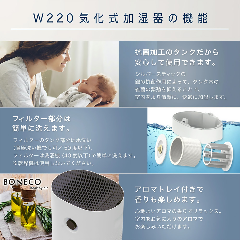 自然に近い気化方式だから 安全・安心! 湿らせたフィルターから水分が気化することで加湿する気化式は自然に近い蒸発作用を利用しています。 ヒーターを使わないので高温になりません。 加湿器本体や吹き出し口が熱くならないので、お子さんやペットがいる家庭でも安心して使用できます。 ◎フィルター部分は簡単に洗えます ◎シルバースティックの銀の抗菌作用によって、タンク内の雑菌の繁殖を抑えます ◎抗菌加工のタンク ◎アロマトレイ付き お部屋の湿度を快適に保って、あなたの家族を元気に。 冬になると流行するウイルスは、湿度が40%以下になると活発に活動を始めます。 室内環境を快適に整えることが、ウイルス対策ではとても大切です。