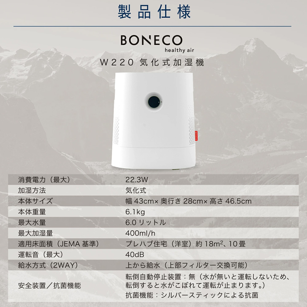 【電源電圧】AC 100V(50/60Hz) 【サイズ(約)】幅43×高さ46.5×奥行き28cm 【コード長(約)】210cm 【重量(約)】6.1kg(タンク空時) 【消費電力】<ノーマルモード>22.3W <スリープモード>11.3W 【加湿方式】気化式 【対応畳数】10畳 【水タンク容量】6L 【加湿量】最大400ml/h 【連続運転時間】約15時間(※ノーマルモード運転時)