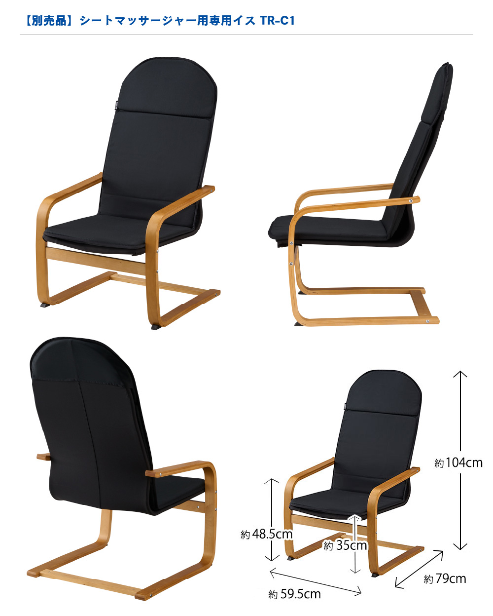 ■フジシートマッサージャー T21 TR-S2 【医療機器認証番号】303AABZX00034000(家庭用電気マッサージ器・管理医療機器) 【定格電源】AC100V 50/60Hz 【定格消費電力】48W(ヒーター6W) 【タイマー】15分自動オフ 【本体サイズ(約)】幅56×奥行48×高さ80cm 【本体質量(約)】8.5kg 【素材】<本体構造部材>ABS樹脂、PP樹脂 <クッション材>ウレタンフォーム <張り材>合成皮革(ポリ塩化ビニル)、その他(ポリエステル、ポリウレタン) 【もみ回数】<首肩部>約34回/分 <背腰部>約36回/分 【エア圧力】最大90kPa 【振動回数】約3800回/分 【ヒーターの最高温度】もみ玉ヒーター 50℃以下 【適応体重】90kg以下 【電源ケーブル】約1.5m 【リモコンコード】約90cm 【付属品】ACアダプター、電源ケーブル 【電気代の目安】<ヒーターとマッサージ>約22円/月 <マッサージのみ>約20円/月 ■シートマッサージャー用専用イス TR-C1(別売) 【本体サイズ(約)】幅59.5×奥行79×高さ104cm 【座面高さ(約)】35cm 【肘高さ(約)】48.5cm 【質量(約)】6kg 【素材】<構造部材>積層材・金属(鋼) <表面加工>ラッカー塗装(木部) <張り材>ポリエステル <クッション材>ウレタンフォーム 【適応体重】90kg以下