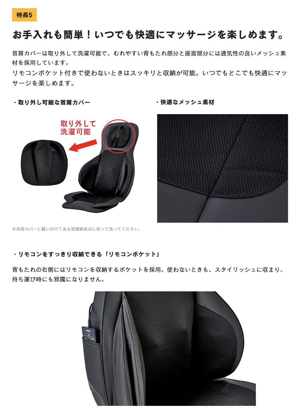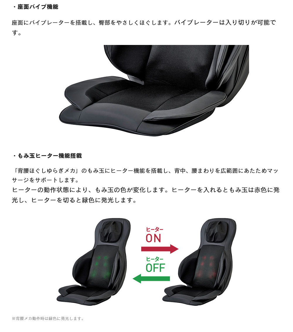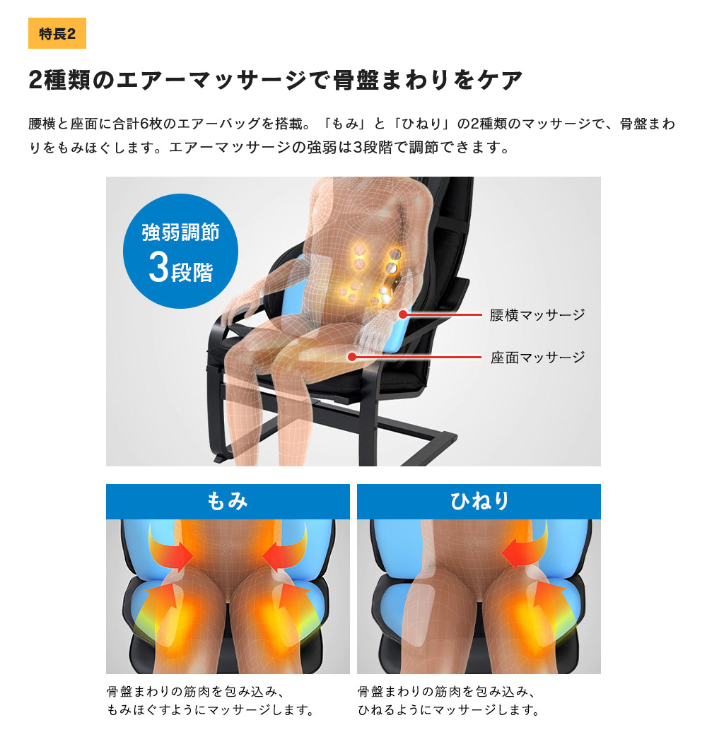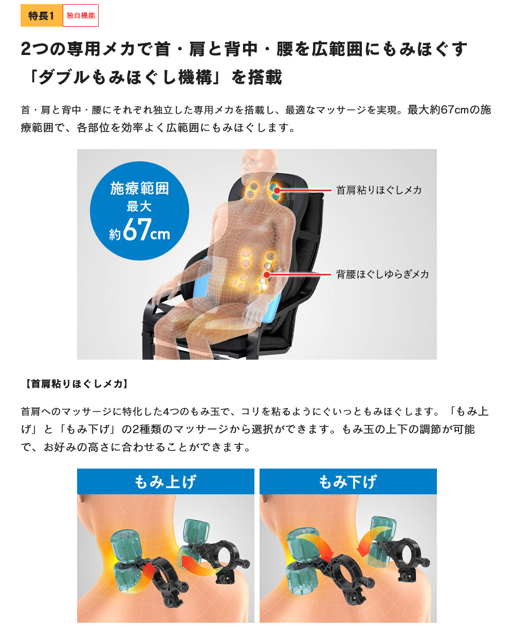 2つの専用メカで首・肩と背中・腰を広範囲にもみほぐす「ダブルもみほぐし機構」を搭載! 首・肩と背中・腰にそれぞれ独立した専用メカを搭載し、最適なマッサージを実現。最大約67cmの施療範囲で、各部位を効率よく広範囲にもみほぐします。 2種類のエアーマッサージで骨盤まわりをケア 腰横と座面に合計6枚のエアーバッグを搭載。「もみ」と「ひねり」の2種類のマッサージで、骨盤まわりをもみほぐします。 エアーマッサージの強弱は3段階で調節できます。 ◎シンプルLEDリモコンで手元で簡単操作 ◎取り外し可能な首肩カバー 【使用目的または効果】疲労回復・血行をよくする・筋肉の疲れをとる・筋肉のこりをほぐす・神経痛、筋肉痛の痛みの緩解 【医療機器認証番号】303AABZX00034000