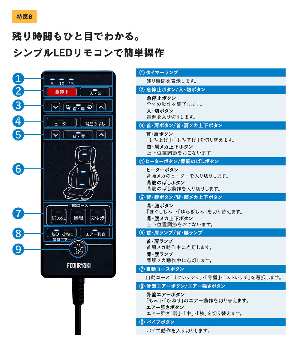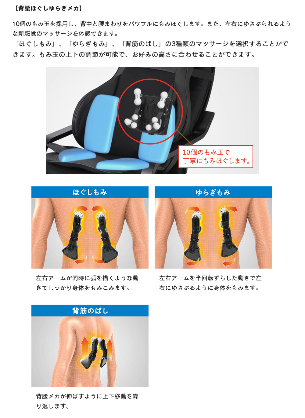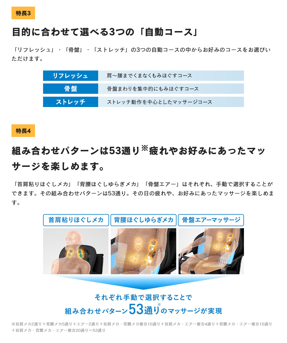 2つの専用メカで首・肩と背中・腰を広範囲にもみほぐす「ダブルもみほぐし機構」を搭載! 首・肩と背中・腰にそれぞれ独立した専用メカを搭載し、最適なマッサージを実現。最大約67cmの施療範囲で、各部位を効率よく広範囲にもみほぐします。 2種類のエアーマッサージで骨盤まわりをケア 腰横と座面に合計6枚のエアーバッグを搭載。「もみ」と「ひねり」の2種類のマッサージで、骨盤まわりをもみほぐします。 エアーマッサージの強弱は3段階で調節できます。 ◎シンプルLEDリモコンで手元で簡単操作 ◎取り外し可能な首肩カバー 【使用目的または効果】疲労回復・血行をよくする・筋肉の疲れをとる・筋肉のこりをほぐす・神経痛、筋肉痛の痛みの緩解 【医療機器認証番号】303AABZX00034000
