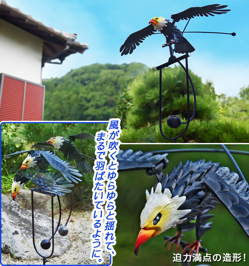 鷲は、強さ・勇気・自由・高貴さ・不死などを象徴する鳥。 世界中の神話や文化、そして国章などでもそのシンボルとして広く用いられています! 迫力満点! 風が吹くとゆらゆらと揺れて、まるで羽ばたいているように。 鳥獣対策にも!