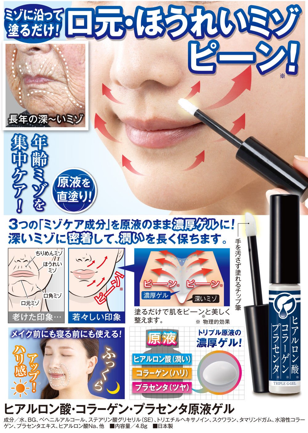 ミゾに沿って塗るだけ!口元・ほうれいミゾ ピーン(※)! 長引く深く刻まれたミゾを集中ケア!原液を直塗り! 3つの「ミゾケア成分」を原液のまま濃厚ゲルに!深いミゾに密着して、潤いを長く保ちます。 ※物理的効果