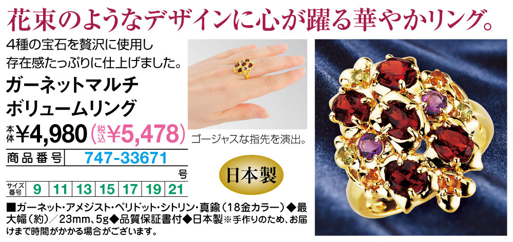 【サイズ】 9号、11号、13号、15号、17号、19号、21号 ■ガーネット・アメジスト・ペリドット・シトリン・真鍮(18金カラー) ◆最大幅(約)/23mm、5g ◆品質保証書付 ◆日本製