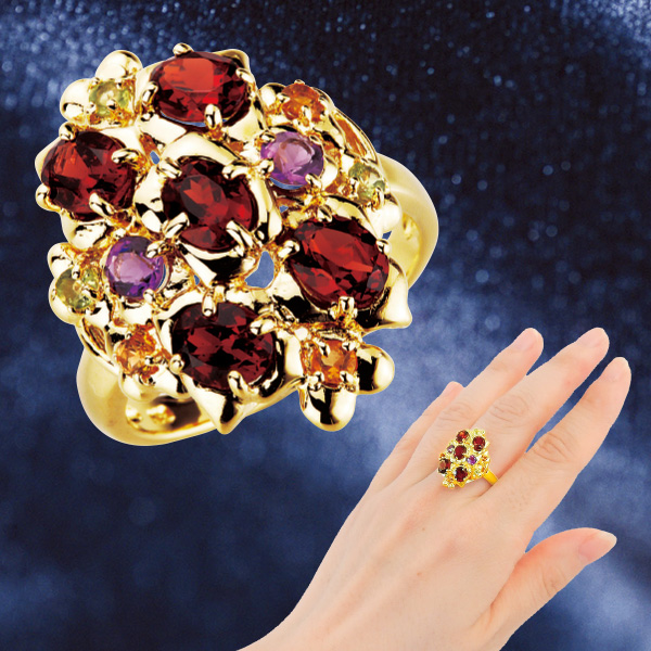 花束のようなデザインに心が躍る華やかリング! 4種の宝石を贅沢に使用し存在感たっぷりに仕上げました。 ゴージャスな指先を演出。