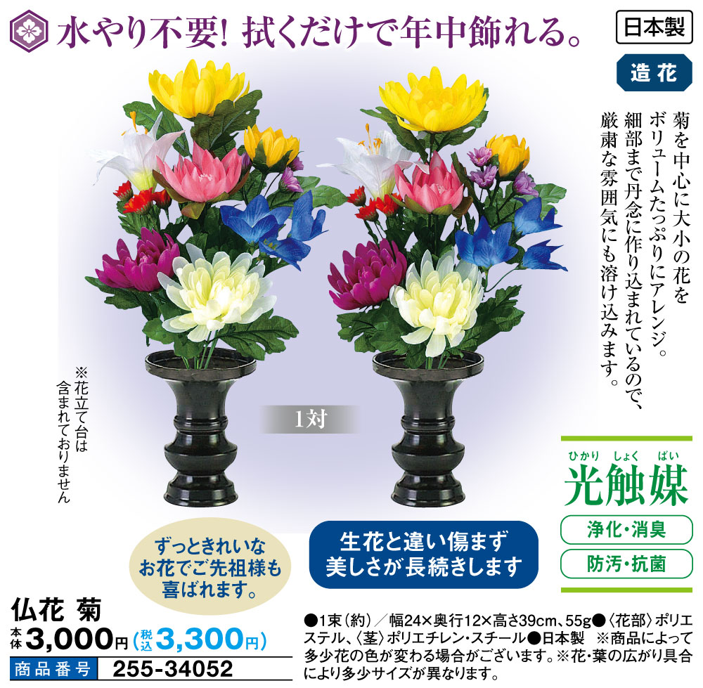水やり不要! 拭くだけで年中飾れる! 菊を中心に大小の花をボリュームたっぷりにアレンジ。 細部まで丹念に作り込まれているので、厳粛な雰囲気にも溶け込みます。 生花と違い傷まず美しさが長続きします ずっときれいなお花でご先祖様も喜ばれます。 【光触媒】 ●浄化・消臭 ●防汚・抗菌 ●造花