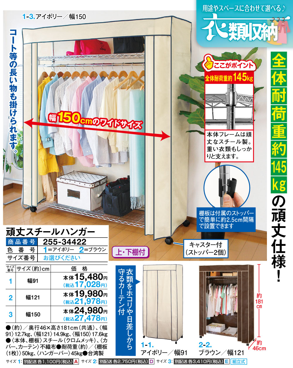 総耐荷重約100kgの頑丈仕様! <ここがポイント:総耐荷重約100kg> 本体フレームは頑丈なスチール製。重い衣類もしっかりと支えます。 上・下棚付 小物を収納できる便利な上棚付 下段の棚にも小物を収納できます 移動に便利なキャスター付(ストッパー2個) 棚板は付属のストッパーで簡単に約25cm間隔で設置できます 衣類をホコリや日差しから守るカーテン付