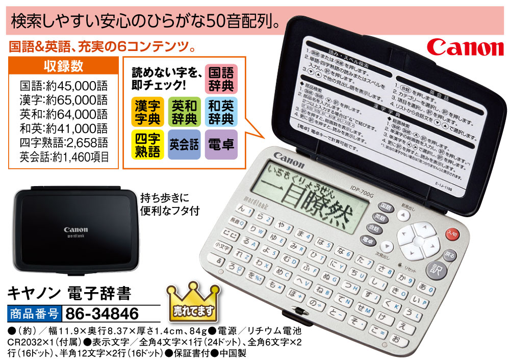 ひらがな対応50音キーなので、アルファベットが苦手な方も大丈夫! ●国語&英語、充実の6コンテンツ。 【読めない漢字を、即チェック!】 ●国語辞典 ●漢字字典 ●四字熟語 ●英和辞典 ●和英辞典 ●英会話 ●電卓 ●収録数 国語:約45,000語 漢字:約65,000語 英和:約64,000語 和英:約41,000語 四字熟語:2,658語 英会話:約1,460項目 ●持ち運びに便利なフタ付