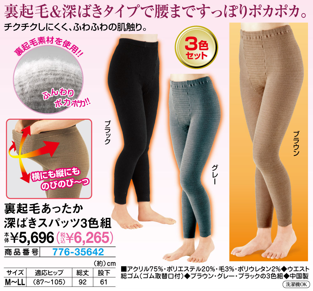 裏起毛&深ばきタイプで腰まですっぽりポカポカ! チクチクしにくく、ふわふわの肌触り。 裏起毛素材を使用!! ふんわりポカポカ!! 横にも縦にものびのび~っ ●3色セット