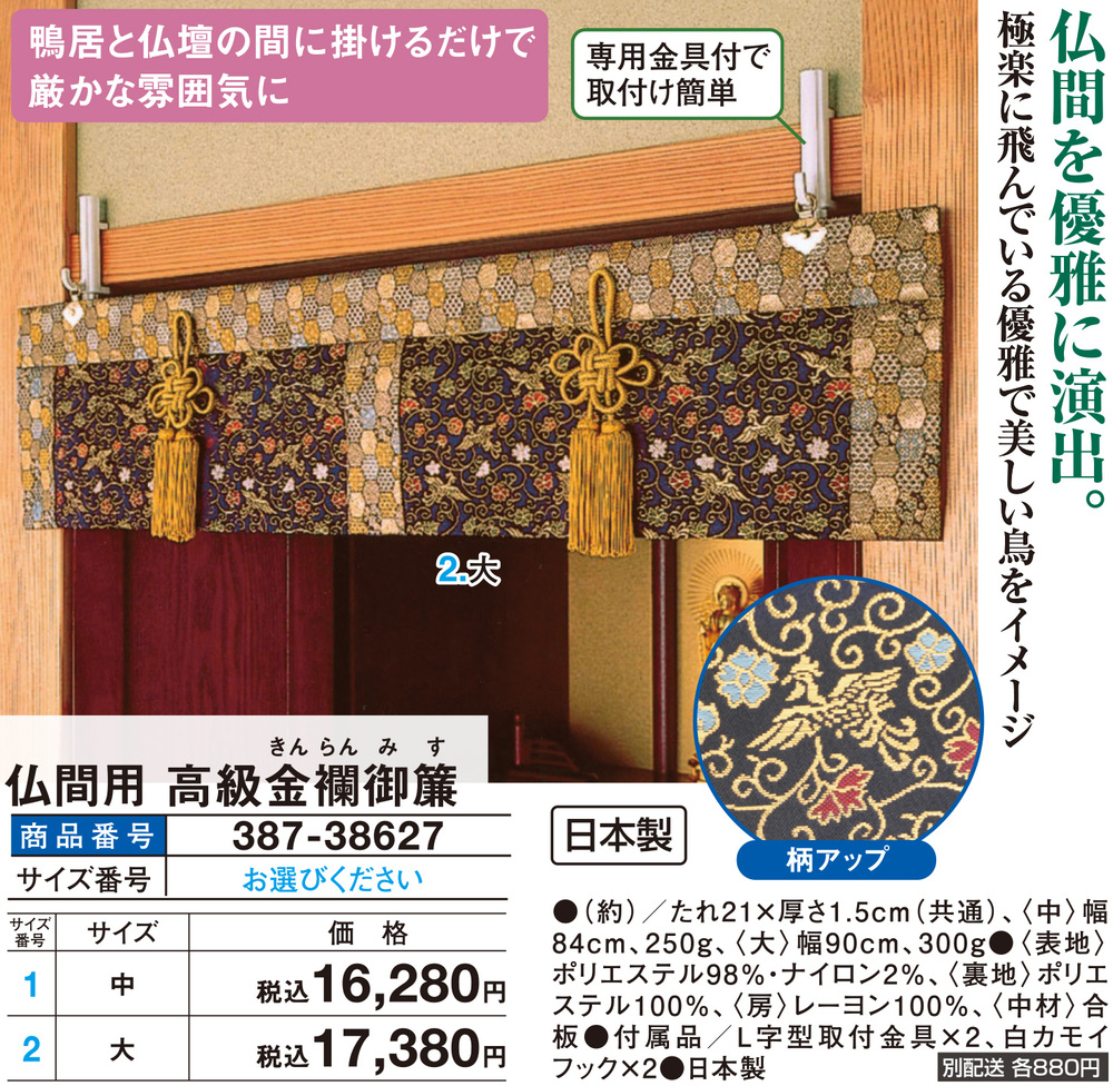 仏間を優雅に演出! ●鴨居と仏壇の間に掛けるだけで厳かな雰囲気に ●極楽に飛んでいる優雅で美しい鳥をイメージ ●極楽にしか咲かないと言われている宝相華(ほうそうげ)をイメージ ●専用金具付で取付け簡単
