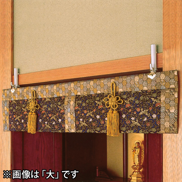 ●( 約 )/たれ21×厚さ1.5cm( 共通 )、< 中 >幅84cm、250g、< 大 >幅90cm、300g ●< 表地 >ポリエステル98%・ナイロン2%、< 裏地 >ポリエステル100%、< 房 >レーヨン100%、< 中材 >合板 ● 付 属 品 / L 字 型 取 付 金 具×2 、白カモイフック×2 ●日本製