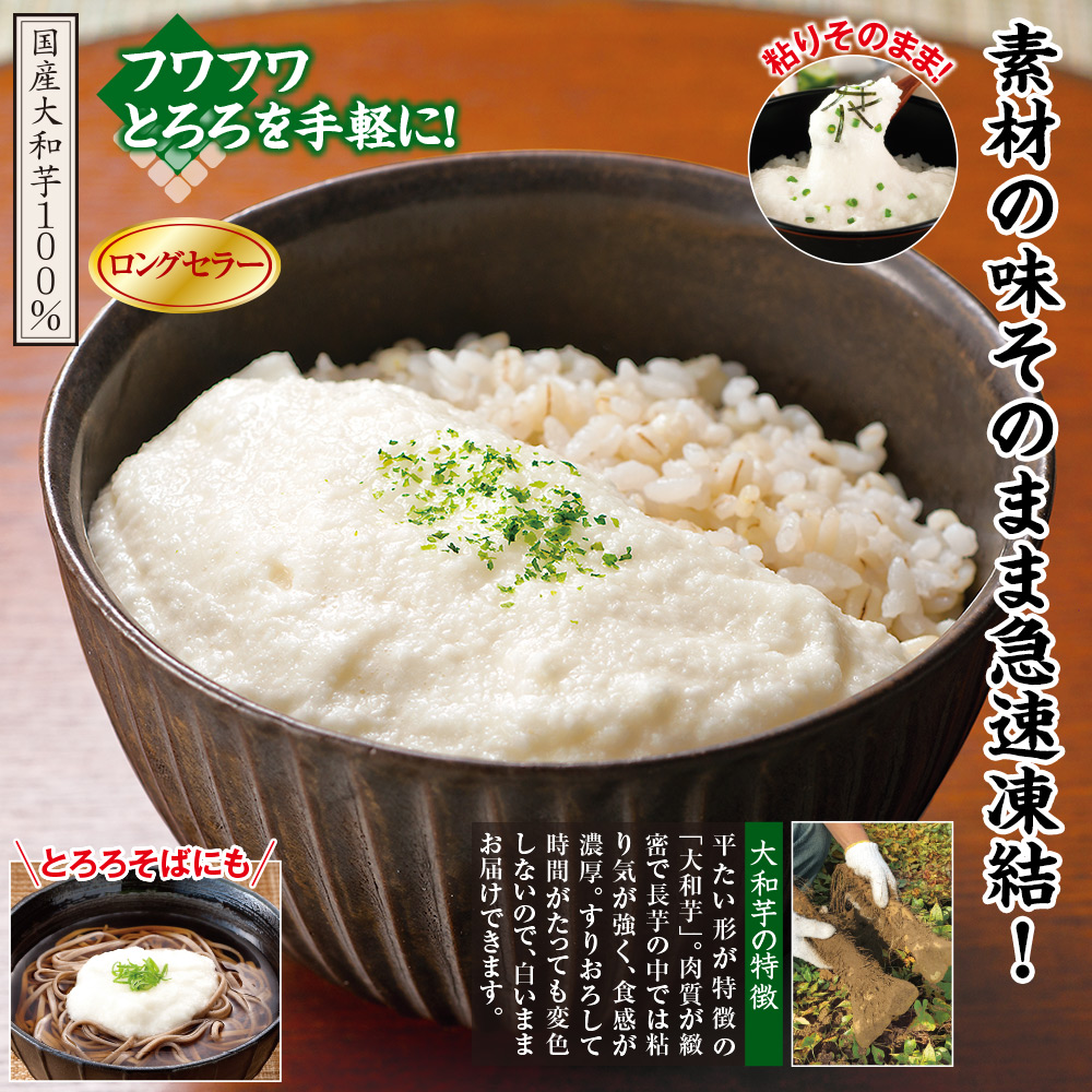 粘りが強く風味高い大和芋とろろを、皮むきやすりおろしの手間なく味わえます。 添加物を使わず、急速凍結した素材本来の味をそのままお楽しみください。 ◎フワフワとろろを手軽に ◎粘りそのまま! ◎すりおろさないので手もかゆくならない! ◎国産大和芋100% ◎使いやすい小袋(1食分)