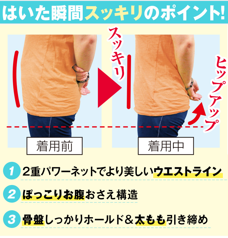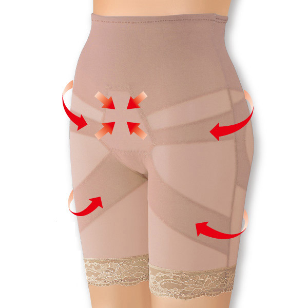 伸縮性のあるパワーネットを使用。 気になる部分を二重仕立てにすることで立体的に効率よく引き締めます。 <骨盤の歪みは下半身太りのもと!> 骨盤周りを引き締め、骨盤の開きやゆがみを改善することで下半身のバランスを整えます。 ■ウエストくびれ構造 二重仕立ての強圧でぽっこりお腹を引き締めます。 ■お腹おさえ構造 フロント部分にはタテ方向にだけ伸びる生地を使用、ぽっこりお腹を押さえます。 ■骨盤引き締め構造 骨盤をサイドからしっかりホールド。 ■太ももシェイプ構造 引き締めてたるみを抑えます。 ■ヒップ立体編み構造 外側から包み込みながらギュッと持ち上げ、 中央部に丸みを逃しヒップラインをキープします。 ・銀 ・チタン ・ゲルマニウム ◎薄いのでアウターにひびかない ◎女性用 ◎直履きOK ◎高級感のあるレース仕様 伸縮性のある素材で薄くてもしっかりサポート、アウターにもひびきにくい仕様です。