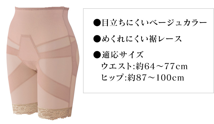 ■サイズ(約): <適応ウエスト>M~L:(64~77)cm <適応ヒップ> M~L:(87~100)cm ※()内はヌード寸法 ■ナイロン92%・ポリウレタン8%(チタン・銀・ゲルマニウム配合)、レース部(裾レースタイプのみ):ナイロン・ポリウレタン・ポリエステル、当て布部:ナイロン・ポリウレタン・ポリエステル ◆ベージュ ◆中国製