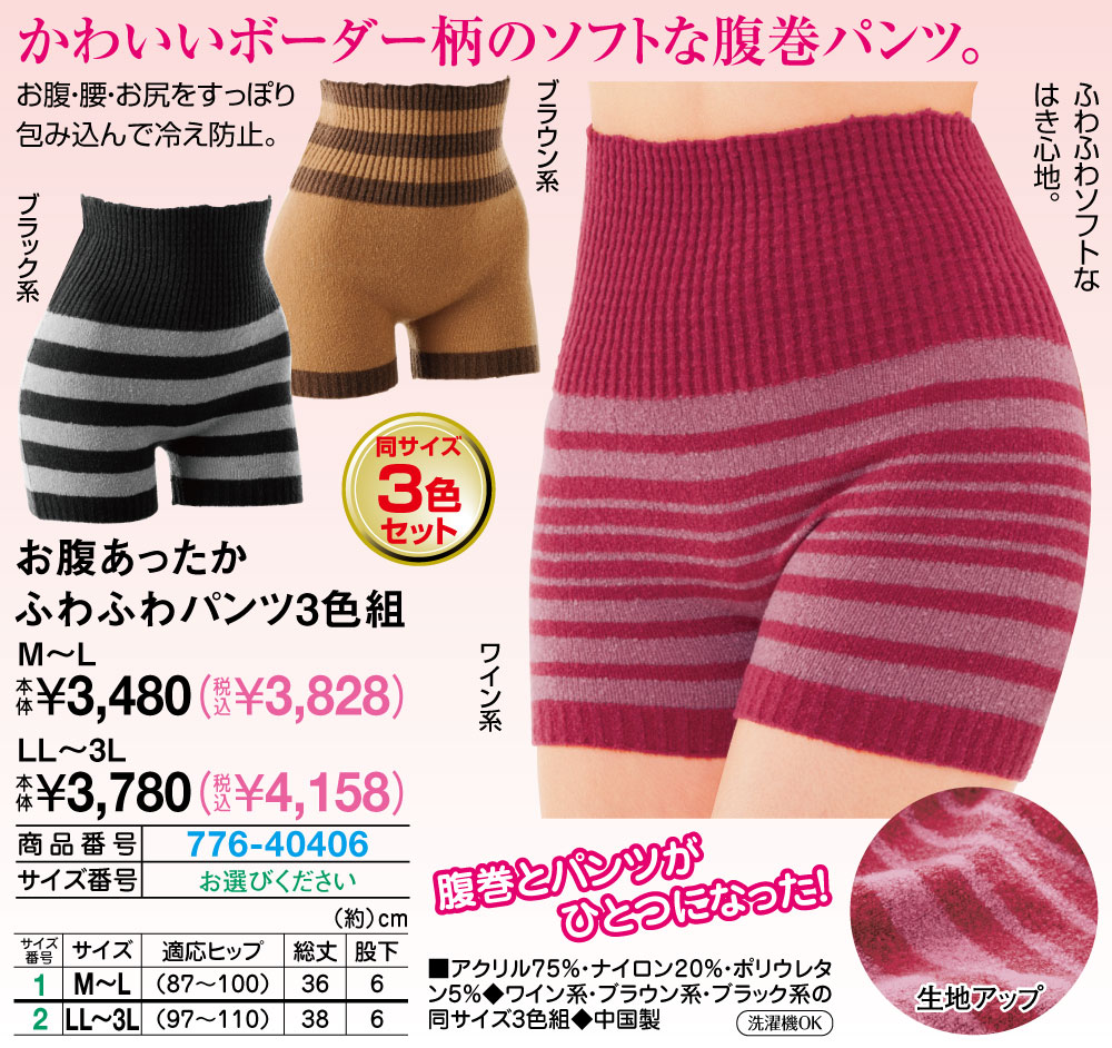 かわいいボーダー柄のソフトな腹巻パンツ! 腹巻とパンツがひとつになった! お腹・腰・お尻をすっぽり包み込んで冷え防止。 ふわふわソフトなはき心地。 ●同サイズ3色セット