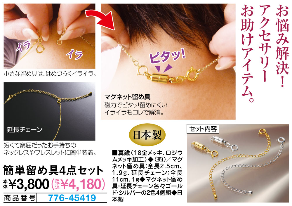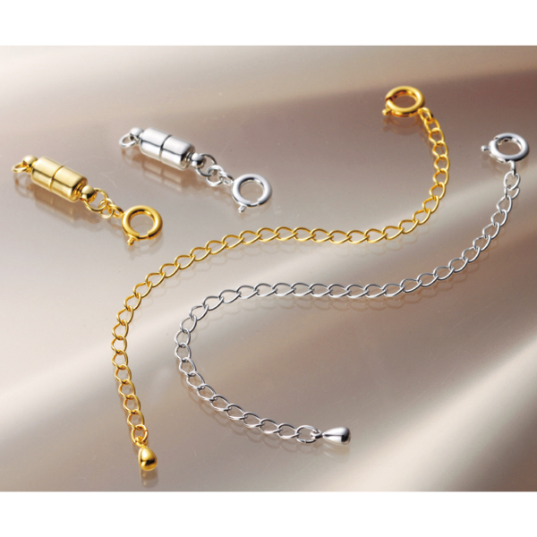 ■真鍮(18金メッキ、ロジウムメッキ加工) ◆(約)/マグネット留め具:全長2.5cm、1.9g、延長チェーン:全長11cm、1g ◆マグネット留め具・延長チェーン各々ゴールド・シルバーの2色4個組 ◆日本製