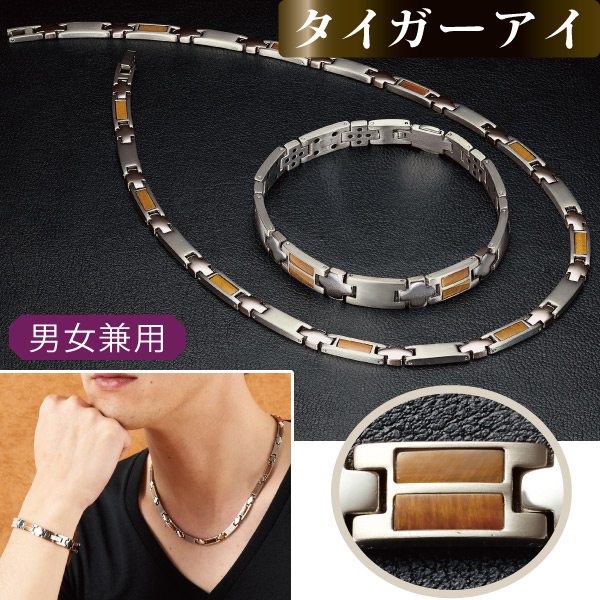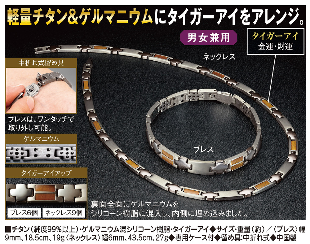 ■チタン(純度99%以上)・ゲルマニウム混シリコーン樹脂・タイガーアイ ◆サイズ・重量(約)/<ブレスレット>幅9mm(共通)、M:長さ18.5cm、19g<ネックレス>幅6mm(共通)、M:長さ43.5cm、27g ◆専用ケース付 ◆中国製