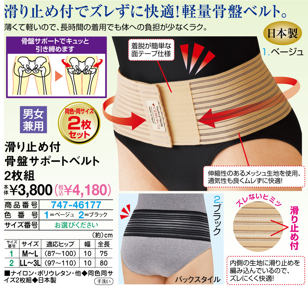 滑り止め付でズレずに快適!軽量骨盤ベルト! 薄くて軽いので、長時間の着用でも体への負担が少なくラク。 着脱が簡単な面テープ仕様 伸縮性のあるメッシュ生地を使用、通気性も良くムレずに快適! 【ズレないヒミツ】 滑り止め付:内側の生地に滑り止めを編み込んでいるので、ズレにくく快適! 骨盤サポートでキュッと引き締めます ●同サイズ2枚セット ●男女兼用