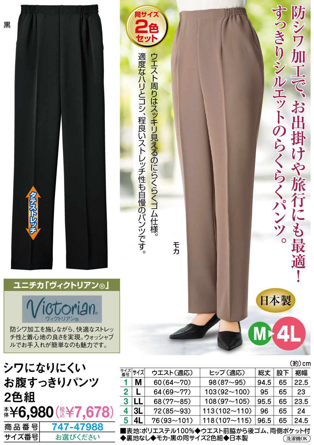 防シワ加工で、お出掛けや旅行にも最適!すっきりシルエットのらくらくパンツ! ウエスト周りはスッキリ見えるのにらくらくゴム仕様。 適度なハリとコシ、程良いストレッチ性も自慢のパンツです。 【ニチカ「Victorianヴィクトリアン(R)」】 防シワ加工を施しながら、快適なストレッチ性と着心地の良さを実現。 ウォッシャブルでお手入れが簡単なのも魅力です。 ●同サイズ2色セット ●M~4L