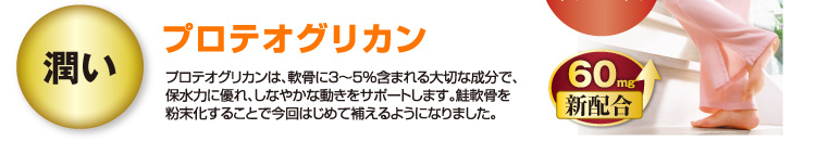 北海道産の秋鮭からわずか0.5%しか採れない希少な軟骨素材を独自配合。水分保持力が知られるコンドロイチンは約2倍(310mg)になりました。コンドロイチンも年齢とともに減少するので、日頃から積極的な補給が大切です。