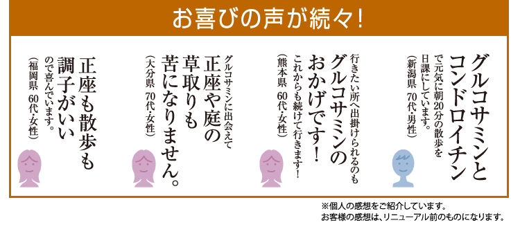 主人の母が、暫く、膝の調子が良かったので、飲むのを良く忘れる事が有りましたが、やはり、グルコサミンを続けて飲まないと膝の調子が悪くなったので、又、慌てグルコサミンを飲むように成りました。他社のグルコサミンをいろいろ試して飲みましたが、楽にはならなかった見たいです。はぴねすくらぶさんのグルコサミンが、主人も、主人の母も合ってる見たいです。