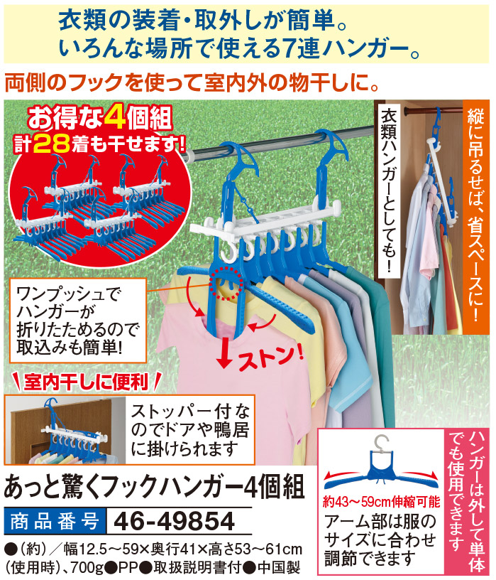 衣類の装着・取外しが簡単!いろんな場所で使える7連ハンガー! ・両側のフックを使って室内外の物干しに。縦に吊るせば、省スペースに!衣類ハンガーとしても! ・ワンプッシュでハンガーが折りたためるので取込みも簡単! 【ハンガーは外して単体でも使用できます】約43~59cm伸縮可能(アーム部は服のサイズに合わせ調節できます) 【室内干しに便利】ストッパー付なのでドアや鴨居に掛けられます ◆お得な4個組