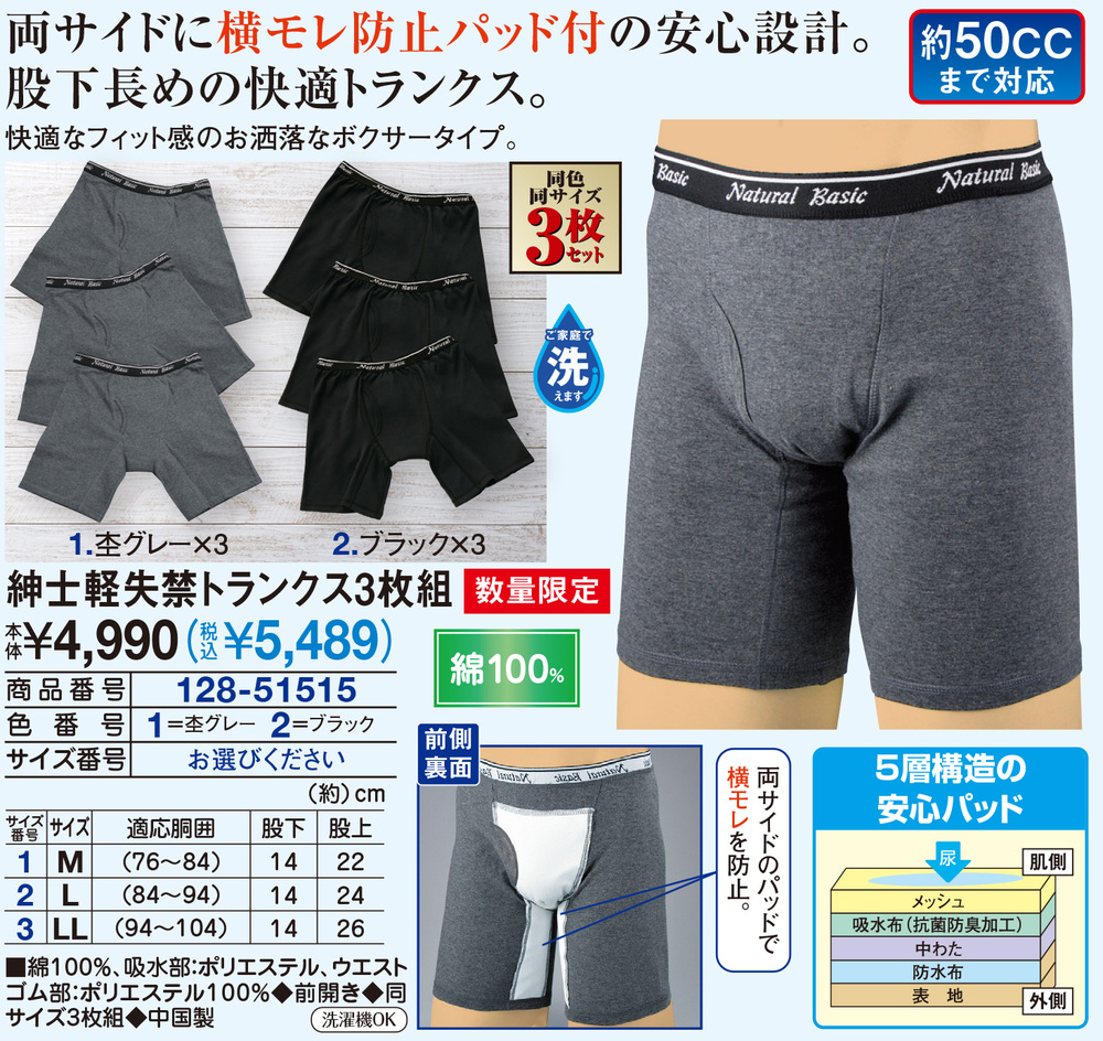 ※肌着の場合、開封後の交換・返品(セット商品の一部含む)は、弊社の規定によりお受けしておりませんので、予めご了承ください。 ※失禁トランクスの吸水量は、吸水部分の無加圧状態での試験結果です。使用条件によっては、吸水量未満でも漏れ出すことがございます。あらかじめご了承ください。 ※表示吸水量は軽度の尿モレ数回に対応するもので、1度に吸収するものではありません。