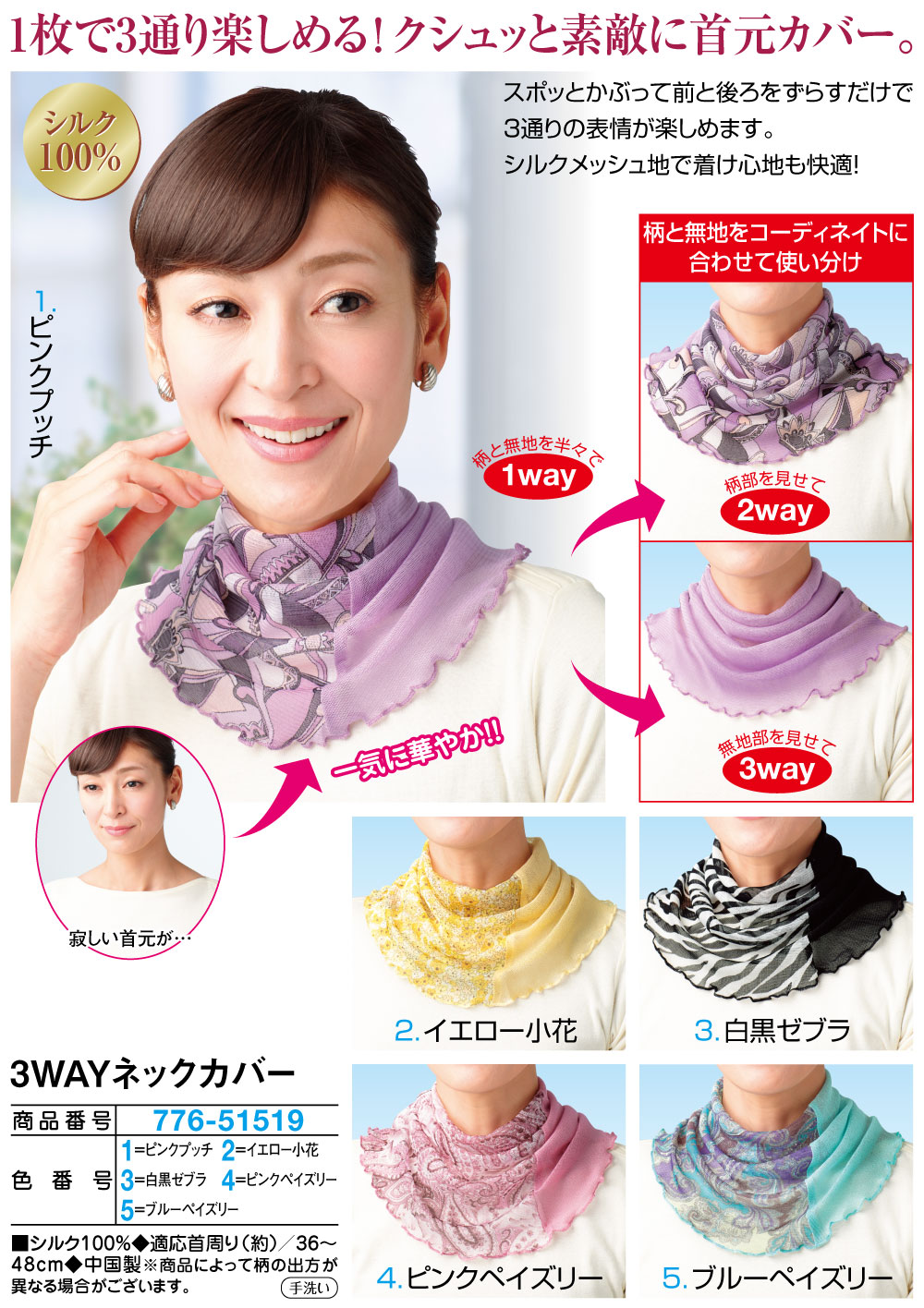 1枚で3通り楽しめる!クシュッと素敵に首元カバー! スポッとかぶって前と後ろをずらすだけで3通りの表情が楽しめます。 シルクメッシュ地で着け心地も快適! 【柄と無地をコーディネイトに合わせて使い分け】 柄と無地を半々で1way 柄部を見せて2way 無地部を見せて3way 寂しい首元が…一気に華やか!! ●シルク100%