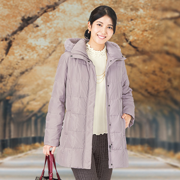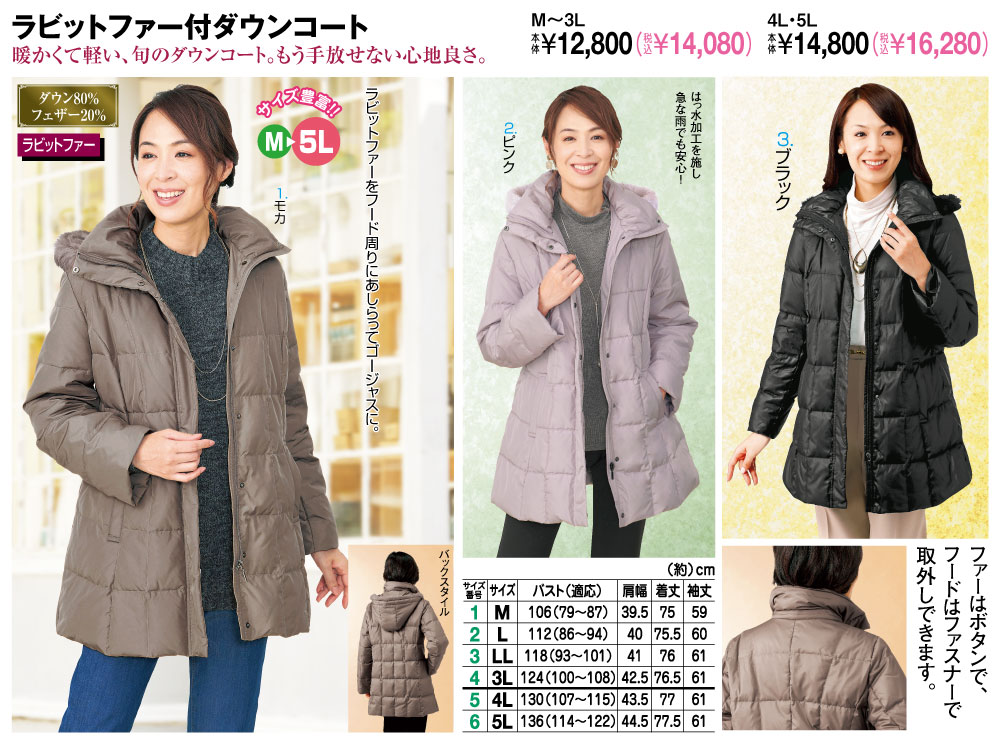 【サイズ(約)】 バスト(適応)、肩幅、着丈、袖丈 <M>106(79~87)cm、39.5cm、75cm、59cm <L>112(86~94)cm、40cm、75.5cm、60cm <LL>118(93~101)cm、41cm、76cm、61cm <3L>124(100~108)cm、42.5cm、76.5cm、61cm <4L>130(107~115)cm、43.5cm、77cm、61cm <5L>136(114~122)cm、44.5cm、77.5cm、61cm ■表地・中わた(衿・フード・前立て・ポケット口):ポリエステル100%、充填物:ダウン80%・フェザー20%、ファー部:ラビット ◆両側ポケット付、前ファスナー付 ◆裏地あり ◆中国製