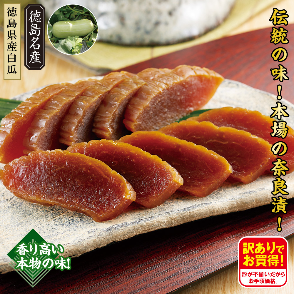 伝統の味!本場の奈良漬! 徳島県産の白瓜を、手間ひまかけ漬け込んだ本物の味わいです。 本来はギフト用の原料として使用している白瓜が、今回大き過ぎて規格外となってしまったものをお得な価格でご提供します。 ■これはお買得! 【訳あり】形が大きく不揃いだからお手頃価格!