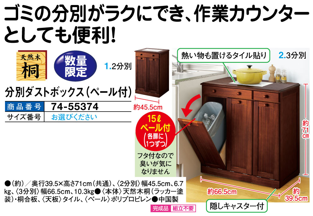 ●(約)/奥行39.5×高さ71cm(共通)、<2分別>幅45.5cm、6.7kg、<3分別>幅66.5cm、10.3kg、<4分別>幅87.5cm、13kg ●<本体>天然木桐・桐合板(ラッカー塗装)、<天板>タイル、<ペール>ポリプロピレン ●中国製 ◆組立不要:完成品でお届けします