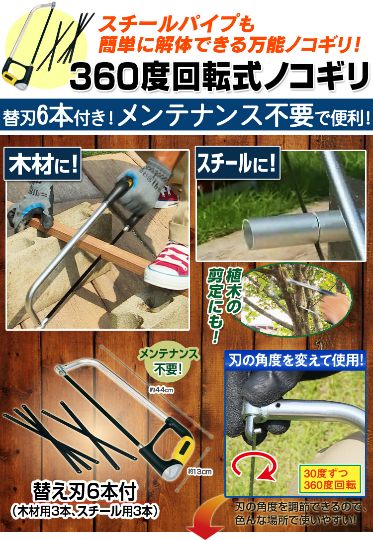 木材はもちろん、硬いスチールの切断も! 30度ずつ360度回転できるので、色んな場所で使いやすい! ◎木材に ◎スチールに ◎ノコギリ替え刃6本付(木材用×3、スチール用×3)