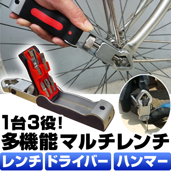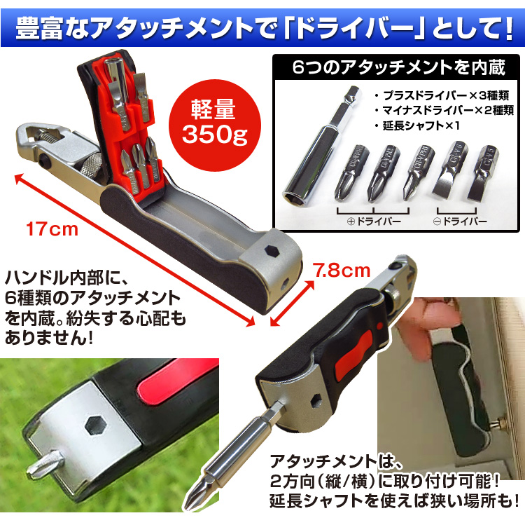 ハンマーやドライバーにもなる! ◎レンチとして ボルトサイズ8~19mmで調節可能 90度まで角度調節可能 ◎ハンマーとして ◎ドライバーとして ドライバーアタッチメント付(+×3、-×2)