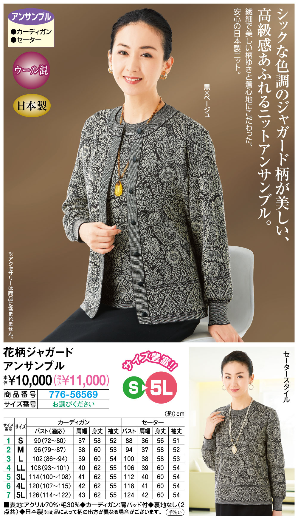 カーディガン【サイズ(約)】 バスト(適応)、肩幅、身丈、袖丈 <S>90(72~80)cm、37cm、58cm、52cm <M>96(79~87)cm、38cm、60cm、53cm <L>102(86~94)cm、39cm、60cm、54cm <LL>108(93~101)cm、40cm、62cm、55cm <3L>114(100~108)cm、41cm、62cm、55cm <4L>120(107~115)cm、42cm、62cm、55cm <5L>126(114~122)cm、43cm、62cm、55cm セーター【サイズ(約)】 バスト、肩幅、身丈、袖丈 <S>88cm、36cm、56cm、51cm <M>94cm、37cm、58cm、52cm <L>100cm、38cm、58cm、53cm <LL>106cm、39cm、60cm、54cm <3L>112cm、40cm、60cm、54cm <4L>118cm、41cm、60cm、54cm <5L>124cm、42cm、60cm、54cm ■表地:アクリル70%・毛30% ◆カーディガン:肩パッド付 ◆裏地なし(2点共) ◆日本製